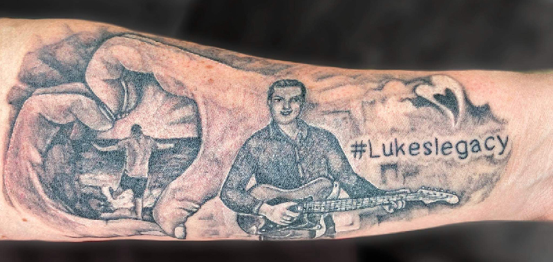 Lucas was a gifted singer and actor, the stage was the home of his heart and where he felt safe. He met his people through theatre. His love for music is displayed through the tattoo as he’s seen holding his guitar continuing to play. The hands are from a photo Lukesmomforever18 and her husband took at the hospital. Luke had a great love of the ocean and felt a connection to it. This tattoo represents the love his parents have for Lucas and the recognition that they will continue the fight for better mental health awareness and support in his name.