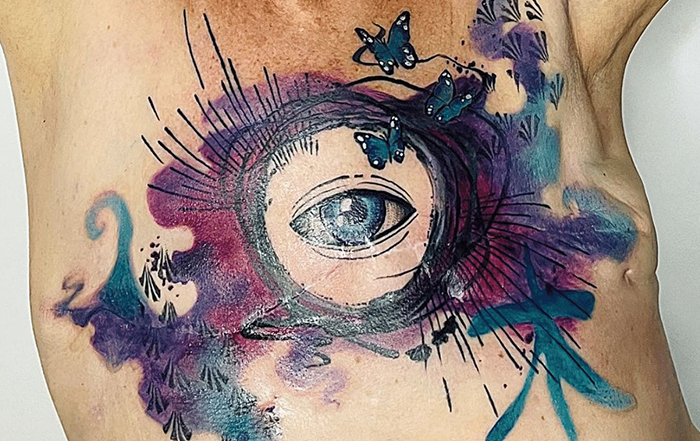 Jade explains that when she was told she needed a mastectomy, she originally asked for both breasts to be removed. However, her surgeon feared she would regret that decision. After she lived miserably for a year with one breast and was not a candidate for reconstruction, he agreed to remove her other breast. “I was miserable with one breast and much happier without any.” Her tattoo artist was thrilled to do this tattoo for her. “I could not wait to get it done, I hated looking in the mirror (and avoided doing so).” She said once she got the tattoo done, she showed it off to anyone that asked. “I was proud of what Nancy had done, and my confidence and moxie went up 100%. Now I love having it peek out of my t-shirt and talking about it. I don’t concern myself about what others may think when they realize I don’t have breasts – I just flaunt the tattoo.”