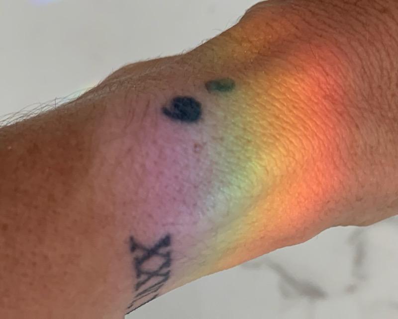 Liliane is a 47-year-old woman from Victoria. She is using her healing tattoo to empower herself, and likes to keep it mostly to herself. She said she decided to use a cystic nevus for the top part of the semi-colon, and that the Roman numeral format makes it more difficult for people to know the date. She picked the left wrist so she could hide it under her watch as needed, letting her choose who gets access to her story.