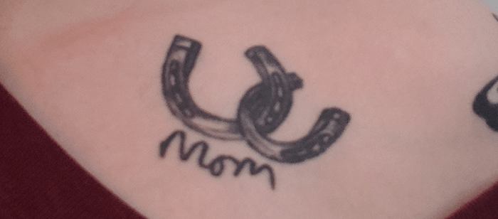 Meg is a woman in her mid-20s from Newfoundland. She has a tattoo of two interlocking horseshoes and the word “Mom” in her mother’s handwriting on her left collarbone. In November of 2017, Meg’s mother passed away after “a difficult battle with an uncommon form of liver cancer.” Meg says that “devastated would be an understatement” for how she felt. “She was the glue that held our very tight-knit family together.” Meg knew she wanted to get a tattoo to honour her mother – she decided on the interlocking horseshoes because they “always bonded over [their] mutual love of horses.” A few weeks after her mother passed, Meg shares that “[she] found an old Christmas tag that [her mother] had signed. [She] never wanted to forget [her mother’s] writing so [she] decided to add it under the horseshoes.” This will always be Meg’s favorite tattoo. Whenever she’s missing her mother, she just has to “look over her heart.”