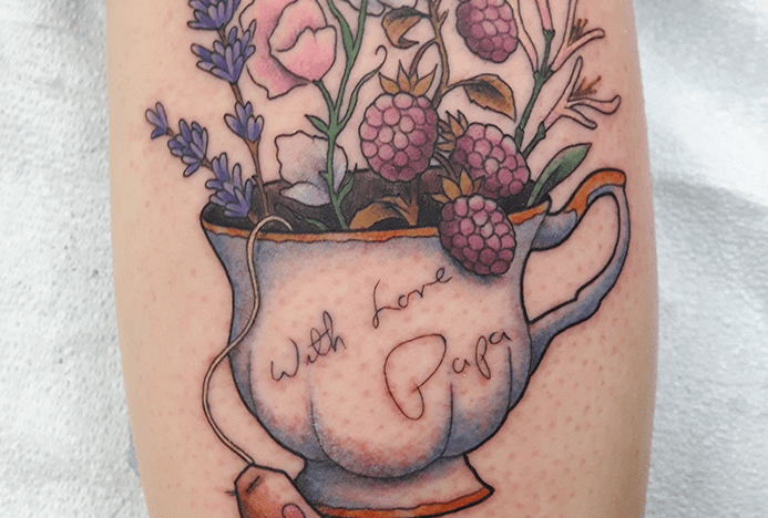Prairie Human is a 27-year-old woman from Regina, Saskatchewan. Prairie Human has a memorial tattoo for her grandpa. It includes a tea cup with his handwriting and flowers for each member of her family. The handwriting is from a card he gave her before he died and the tea cup was chosen because they would always drink tea at his house. As for the flowers, Prairie Human says, “The raspberries are for my grandma, honeysuckle for my sister as she has a bumblebee tattooed on her, [and] sweet peas and lavender for my parents.” She picked the overall design and the specific flowers, and the tattoo artist put it together. Prairie Human picked the location of the tattoo so she could hide it if necessary.