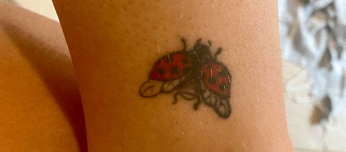 Rabbitwrangler is a woman in her 40s from Pittsburgh whose mother died unexpectedly at the age of 58. Her mother always wanted to get a tattoo of small ladybug on her ankle but never got around to getting one. On the anniversary of her mother’s death, she decided to get a ladybug tattoo on her ankle that looks like it is “in flight” to honour her. She says, “I look at it as a reminder to seize the day and to free my fucks. It’s a gift to grow old, to inhabit this mortal coil.” When her mother died, she shares that she felt like she was wandering around without a map. In getting the tattoo she felt like she was “getting a set of directions to follow, however small. It was a like a bit of her guidance.” She told her mother’s sister and best friend about the tattoo, and they both got ladybug tattoos on their ankles too. “It helped us all feel close to her.”