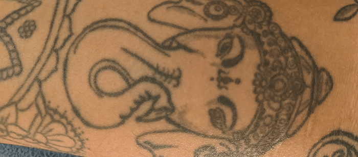 Healed by Ink is a woman in her mid 20s. She has a tattoo of “one of many traditional depictions of Ganesh.” When discussing her tattoo, Healed by Ink says that “when [she] was committed to no longer inflicting self-harm on [her]self, [she] got Ganesh tattooed over her scars. Ganesh is known as the remover of obstacles in Indian culture.” Healed by Ink shares that, “The tattoo signifies a promise to [her]self that [she] won’t harm [her]self anymore. [She] made it through some really difficult stuff, and [she is] still here and working through all of life’s obstacles.”