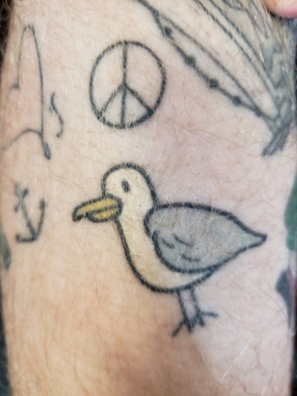 Jayce’s uncle John was the first person in his life that had tattoos; his seagull is a memorial to him, as John used to refer to these commonplace birds in Newfoundland as “shit hawks.” Jayce speaks about how silly tattoos can still have meaning and is a form of self-expression. They hold “lots of meaning, even small silly ones.”