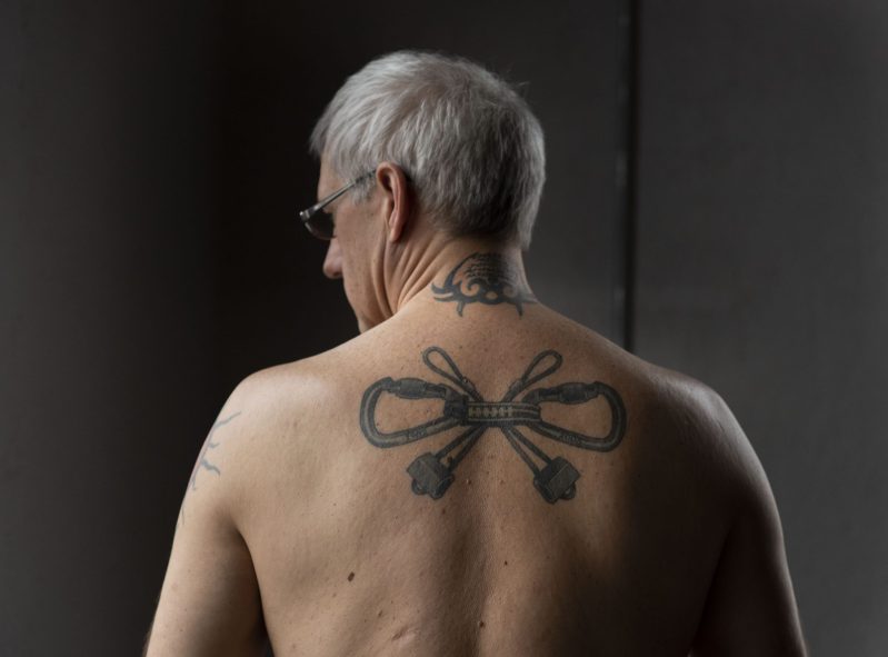 For the tenth anniversary of his passing, this father wanted a large tattoo to honour his son who loved rock climbing. The carabiners and cams form an X which is both a cross and the Roman numeral 10.