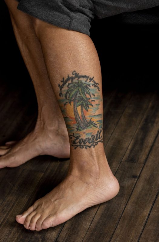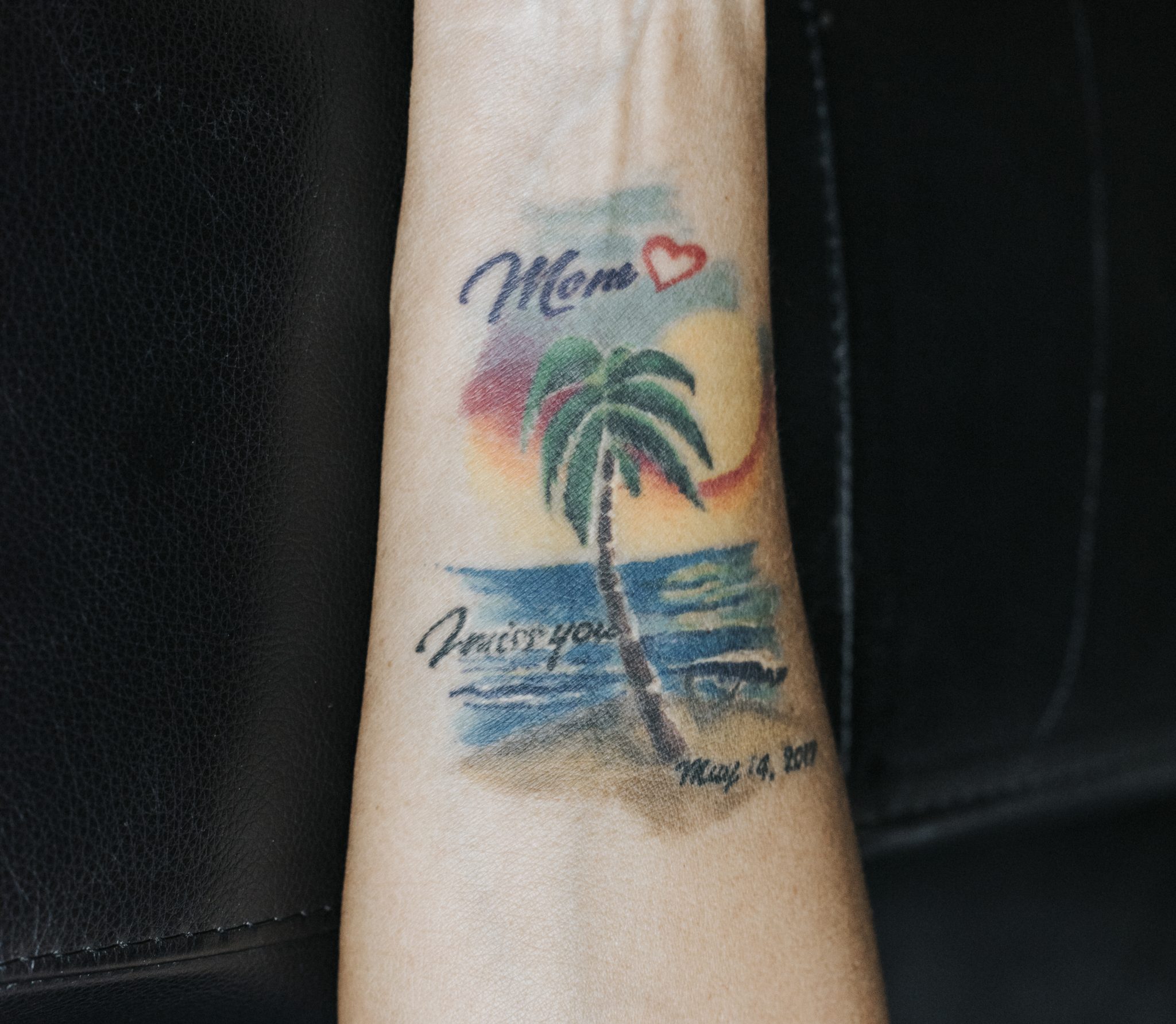 The tattoo on her leg depicts warm weather, palm trees and beaches in paradise. “There is a beach with two palm trees, a taller one and a shorter one, with me overlooking him; it’s basically me watching over him in paradise.” The tattoos are on the left side of her body because the son was left-handed.