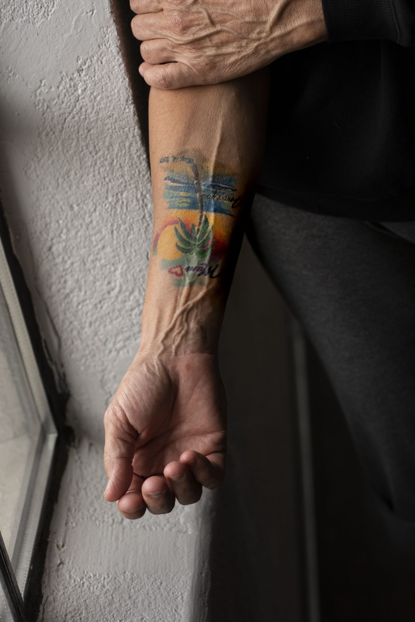 “I tilt my legs when I’m sitting, so that I can see it. And I keep it moisturized all the time. Every day. It’s like my aspect of keeping care of him, because I can’t do it physically anymore…